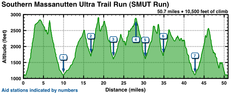 Altitude profile of the SMUT 50. Locations of the seven aid stations are indicated.