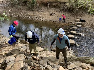 Trail running isn't much without trails. On October 21, John Stacy, Sirisha "Iris" Golla, Francesco "Smitty" Smith, Jeff Reed, and Keith Knipling contributed roughly 20 person-hours repairing the steps at the Pope's Head Creek crossing on the Bull Run Occoquan Trail near Hemlock Overlook. These steps had been damaged during the heavy rains this spring and summer. All Bull Run Run 50 runners, and countless trail users, will benefit from this work. The VHTRC will be doing another trail-working outing this winter — hope to see you out there. (Iris is making a strong statement for Volunteer of the Year, after staffing an aid station yesterday at the Quad State Quad Buster.)